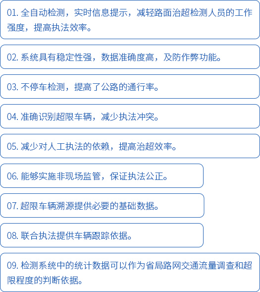 不停車超限超載檢測系統(tǒng)主要用于非現(xiàn)場執(zhí)法的治超系統(tǒng)將不停車動態(tài)稱重、視頻監(jiān)控、圖像抓拍及車牌識別、信息提示系統(tǒng)等有機(jī)集成,建立起一個全天候貨運車輛超載違法行為監(jiān)控系統(tǒng),對貨運車輛超載行為實施有效檢測和監(jiān)控,為交通管理部門提供治超執(zhí)法依據(jù)。在車輛行駛狀態(tài)中的超限超載檢測,有利于提高交通效率。系統(tǒng)的檢測數(shù)據(jù)資源可為公路行業(yè)交通量調(diào)查、路網(wǎng)監(jiān)測等管理工作提供共享信息。
